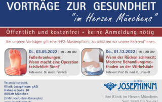 Fußerkrankungen: Wann macht eine Operation tatsächlich Sinn? Di., 03.05.2022 | 19 - 20 Uhr Referentin: Dr. med. I. Fröhlich Wenn der Rücken schmerzt: Moderne Behandlungsmethoden an der Wirbelsäule Do., 01.12.2022 [...]