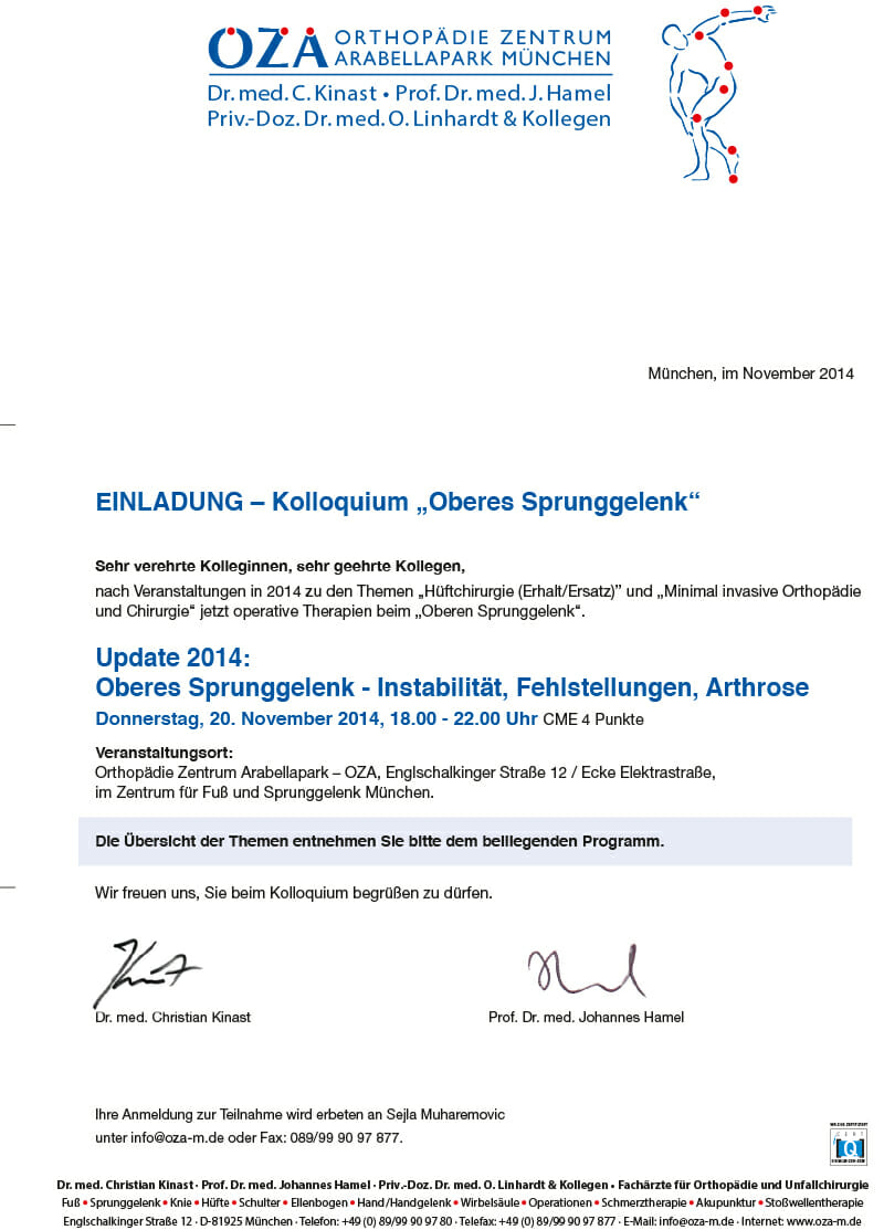 - Programm zum KOLLOQUIUM Update 2014: Instabilität, Fehlstellungen, Arthrose – Oberes Sprunggelenk